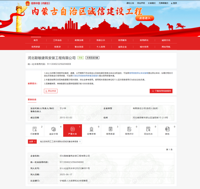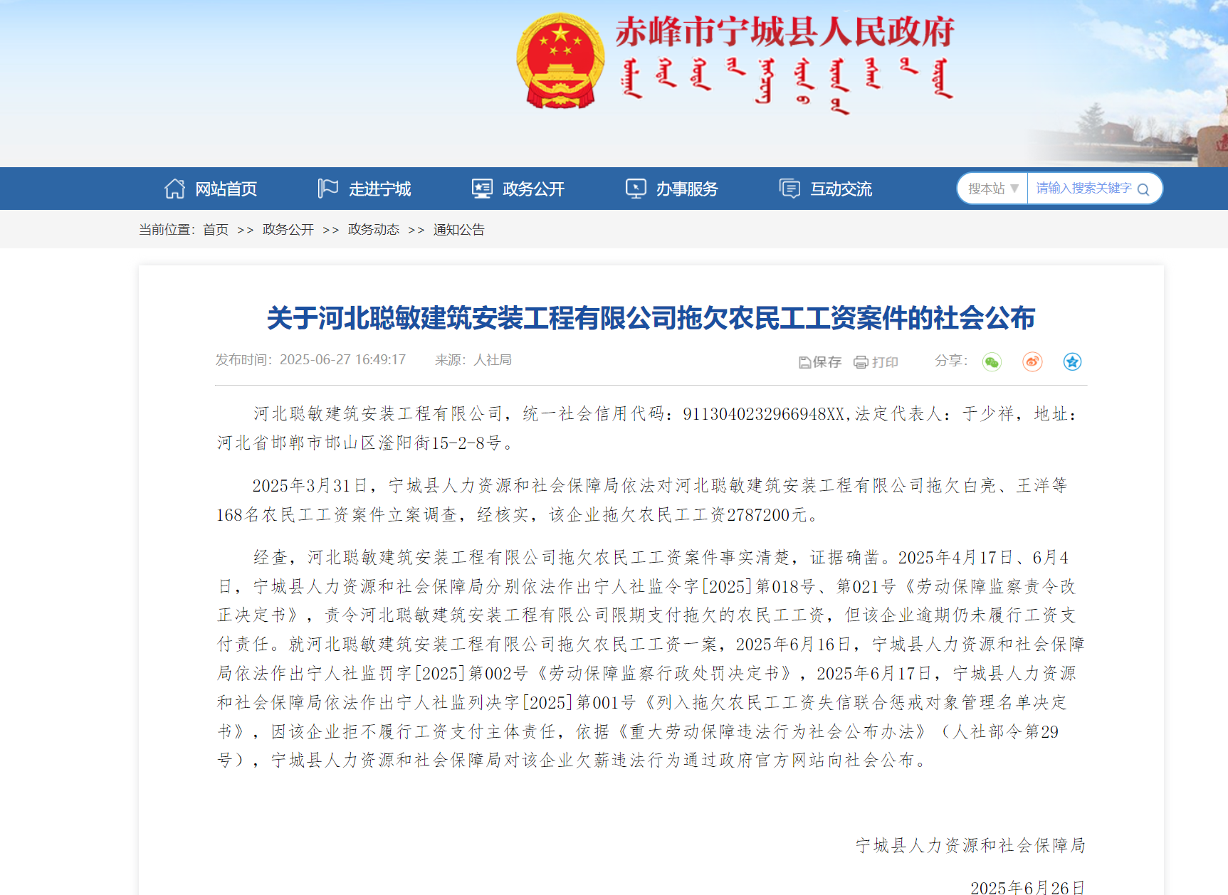 近日,新黄河记者于赤峰市宁城县人民政府官网获悉,宁城县人社局通报:2025年3月31日,宁城县人力资源和社会保障局(下称“宁城县人社局”)就聪敏公司拖欠白某、王某等168名农民工工资一案立案调查,核实欠薪金额278.72万元。2025年4月17日、6月4日,宁城县人社局先后作出宁人社监令字[2025]第018号、第021号《劳动保障监察责令改正决定书》,责令河北聪敏公司限期付薪,但其逾期未履行。6月16日,宁城县人社局对其作出宁人社监罚字[2025]第002号《劳动保障监察行政处罚决定书》;6月17日,再作出宁人社监列决字[2025]第001号《列入拖欠农民工工资失信联合惩戒对象管理名单决定书》,将其纳入失信惩戒名单,公布日期为2025年6月26日。